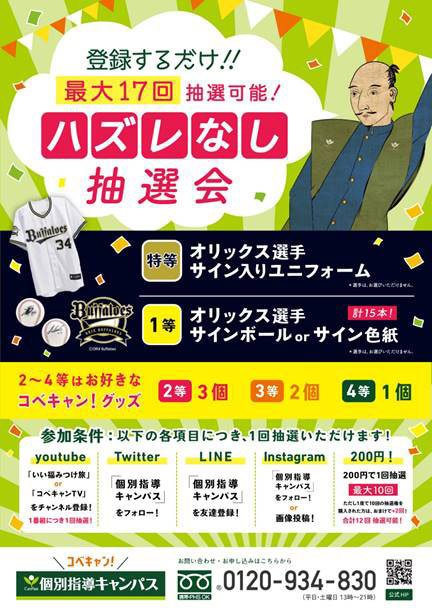 8月3日(土)・4日(日)・24日(土)・25日(日)の4日間、球場内特設ブース(3日は8ゲート前、4日・24日・25日は13ゲート前)にて、ハズレなしの抽選会を実施いたします!下記参加条件を1つでもクリアしていただいた方には、バファローズ選手直筆サイン入りユニフォーム、直筆サイン入りボールor色紙、さらに個別指導キャンパス×オリックス・バファローズオリジナルデザイングッズが当たる抽選会にご参加いただけます。皆様奮ってご参加ください♪(各日景品がなくなり次第終了いたします。)