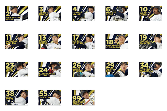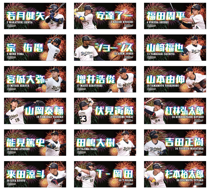 | 球団公式オンラインショップ<受注> | 若月・安達・福田・宗・ジョーンズ・山崎福・宮城・増井・山本・山岡・伏見・紅林・能見・田嶋・吉田正・来田・T-岡田・杉本 |