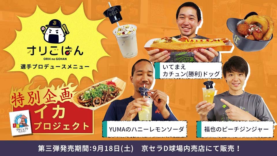 山本由伸投手のイカへの情熱を皆様に伝える特別企画「イカプロジェクト」も最終章の第三弾!その他おなじみのヘルメット容器やメガホン容器で提供するメニューや、いてまえドッグを取り揃えております。今回も色とりどりの新メニューをご用意しておりますので、ガッチリご堪能いただき、力のこもった応援をよろしくお願いいたします!