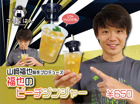 | 商品紹介 | 『福也のピーチジンジャー』 山崎福投手の好きな桃とジンジャーエールを使った後味スッキリなドリンクです。果肉とスパイシーな香りが絶妙にマッチし、ちょっぴり大人の味わい♪ |