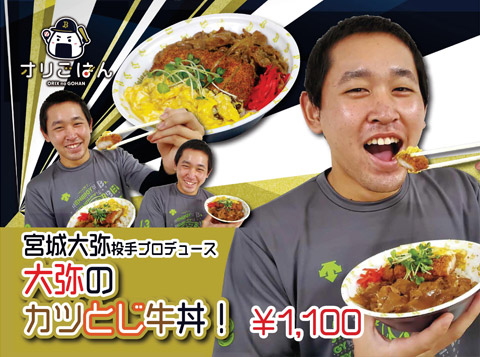 | 商品紹介 | 『大弥のカツとじ牛丼!』 宮城投手の好物、牛丼とカツ丼が一皿に!ご飯にぴったりに味付けされた牛肉と、ジューシーなとんかつが味わえる『よくばり丼ぶり』です!ガッチリ食べたいオリ達の皆さん、ぜひご賞味あれ! |