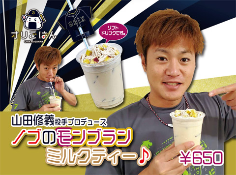 | 商品紹介 | 『ノブのモンブランミルクティー♪』 山田投手の好きなミルクティーが秋の風味に衣替え。モンブランホイップとさつまいもをトッピングし、まろやかで深みのある味わいに仕上げました。よ~く混ぜてお楽しみください♪ |