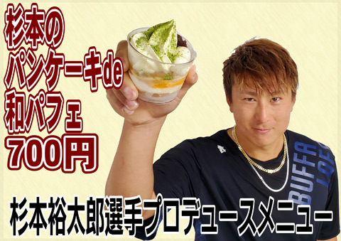 | 商品紹介 | 『杉本のパンケーキde和パフェ』 杉本選手の「大好き!」を詰め込んだパフェの登場です。パンケーキをメインにソフトクリーム、白玉、あんこ、みかん、抹茶パウダーをトッピングし、あんみつのような和テイストに仕上げました♪ |