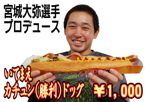 | 商品紹介 | 『大弥のいてまえカチュン(勝利)ドッグ』 ガーリック風味の沖縄焼きそばとポークランチョンミート(スパム)を挟んだ沖縄風いてまえドッグです! |