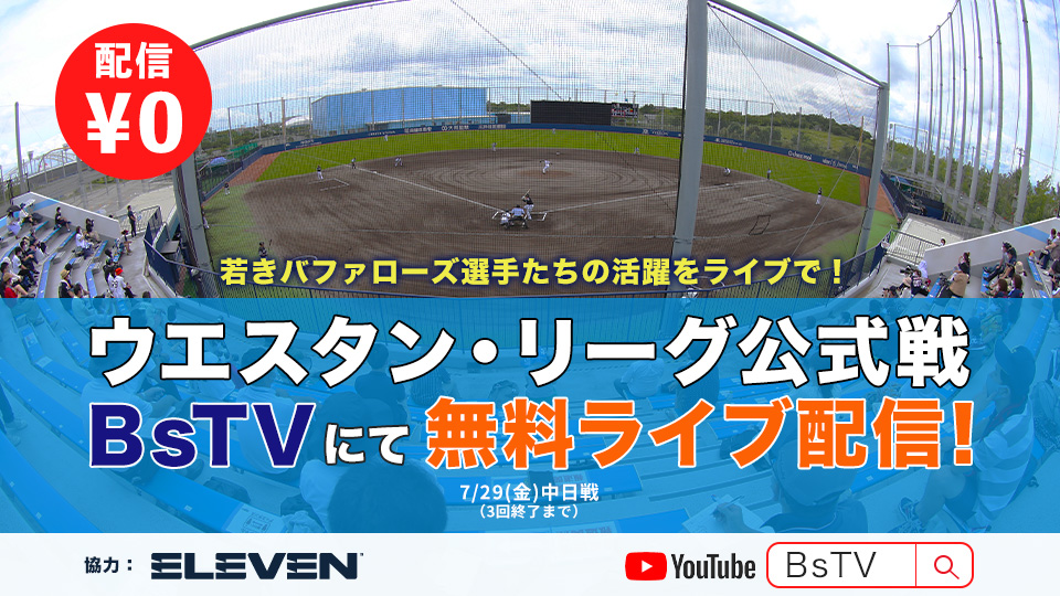 杉本商事バファローズスタジアム舞洲で行われるファーム公式戦を、イレブンスポーツ協力のもと、球団公式YouTubeチャンネル「BsTV」にてライブ配信!7月の配信日が決まりました!