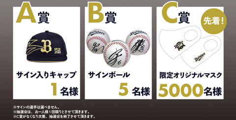 来場者の方は、SmartNews アプリ内のバファローズチャンネルをご提示いただくだけで、プレゼント企画にご参加いただけます。(その場でアプリをダウンロード→チャンネル登録いただいてもOK)。プレゼントはバファローズのロゴ入りマスクや、選手直筆サイン入りグッズをご用意しています。