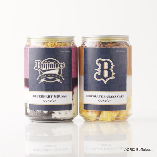 オリックス・バファローズケーキ缶は、濃厚なブルーベリーフレーバーが美味しい「ブルーベリーのムース」と、子どもから大人まで大好きな「チョコバナナケーキ」の2種類を展開いたします。またバファローズ以外のパ・リーグ球団のケーキ缶も販売いたします。