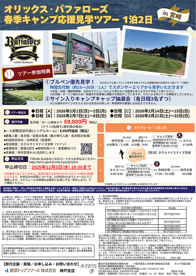 昨年に引き続き東武トップツアーズ主催のもと「春季キャンプ応援見学ツアー」が2026年2月の週末に実施されます。