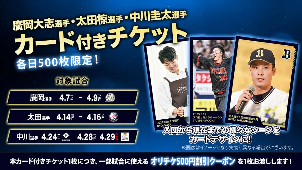 チケット2026/01/23 (金)4月公式戦で廣岡大志選手・太田椋選手・中川圭太選手カード付きチケットを販売! -