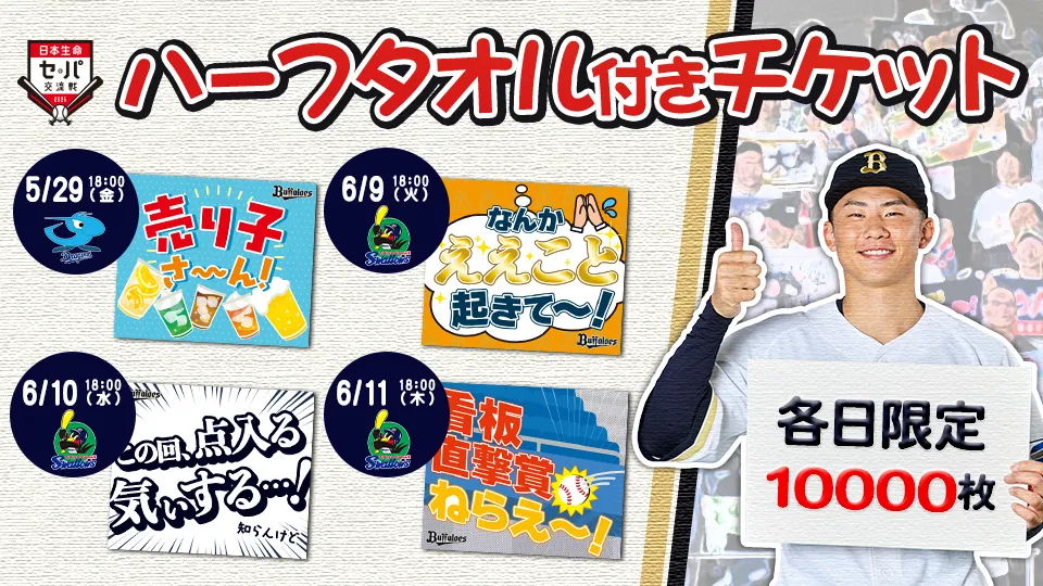 チケット2026/04/03 (金) NEW!【4/3更新】日本生命セ・パ交流戦でハーフタオル付きチケットを販売! -