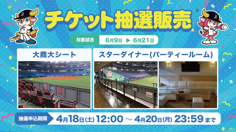 チケット2026/04/03 (金) NEW!日本生命セ・パ交流戦および6月公式戦(6/9~6/21)大商大シート・スターダイナー(パーティールーム)抽選販売のお知らせ -
