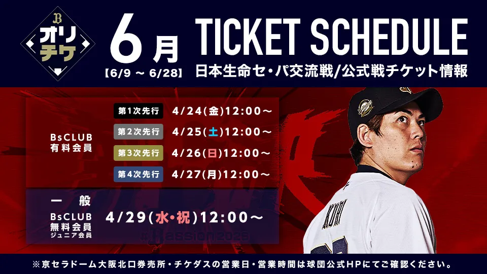 チケット2026/04/15 (水)【4/15更新】日本生命セ・パ交流戦および6月公式戦(6/9~6/28)チケット販売概要のお知らせ -
