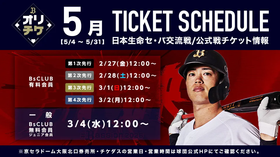 チケット2026/04/08 (水)5月公式戦の券売・開門時間(オリックス主催ゲーム) -