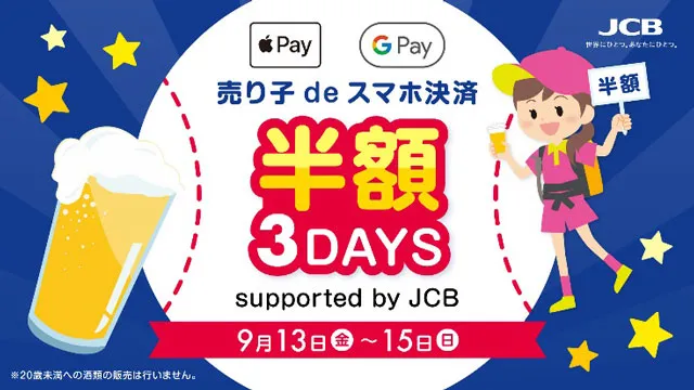 グルメ2024/09/11 (水)9/13(金)~15(日)「売り子deスマホ決済 半額3DAYS supported by JCB」 -
