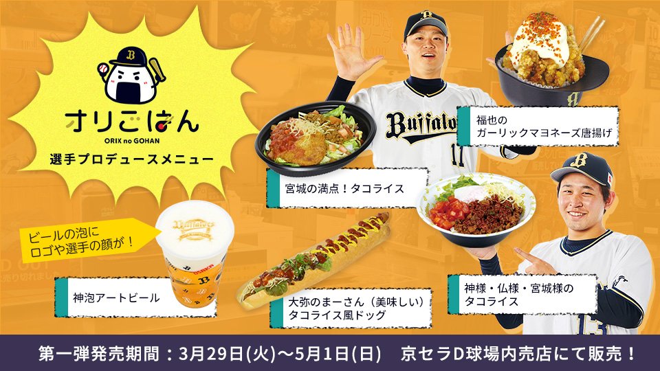 絶賛販売中のオリごはん!宮城投手プロデュース「タコライスメニュー」や、おなじみヘルメット容器の「選手プロデュースメニュー」などをご用意しております!また今シーズンより、ビールの泡に選手の顔や球団ロゴが描かれる「神泡アートビール」も登場です!
