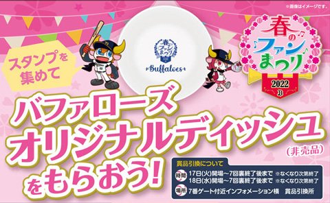 スタンプを集めてバファローズオリジナルディッシュ(非売品)をもらおう!グッズ購入・グルメ飲食購入・SNS投稿イベント参加でスタンプ3つ集めると、各日先着300名様にプレゼントいたします。