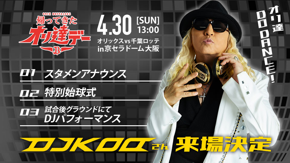 日本屈指の盛り上げ番長、DJ KOOさんがドームに来場!スタメンアナウンスや特別始球式、イニング間の盛り上げだけでなく、試合後にはグラウンドにてDJパフォーマンスも!