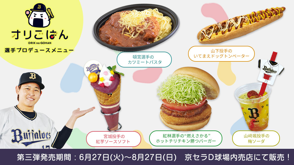 「山下投手のいてまえドッグトンペーター」「頓宮選手のカツミートパスタ」「宮城投手の紅芋ソースソフト」など、新メニューが多数登場です!