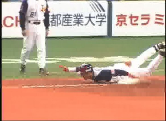 投手 岸 8番 日高 一ゴ 低めのボールにバットを止めたが、打球はフェアゾーンに |