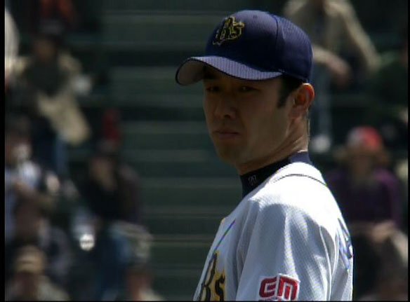 投手 川越 9番 金子誠 空三振 縦に落ちる変化球にバットが空を切った! |