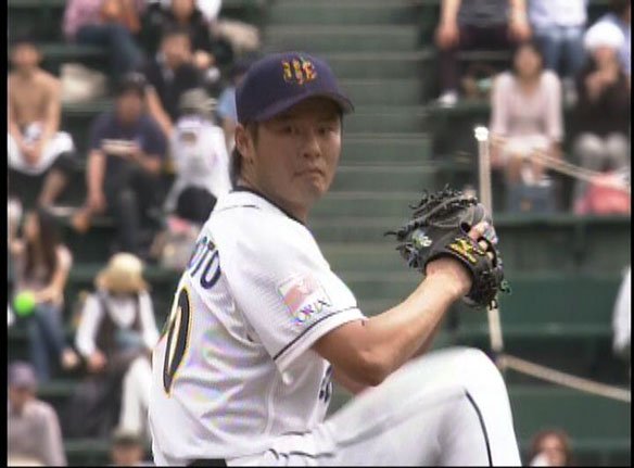 投手 山本 6番 飯原 投バゴ 3塁側へセーフティバントを仕掛けられるが、ピッチャー山本がすばやくさばいた! |