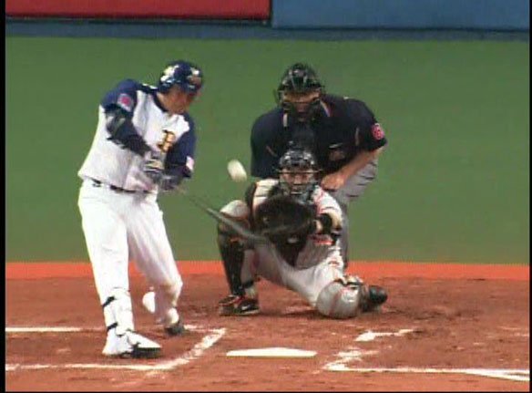 5番 阿部 一邪飛 フルカウントから変化球を打ち上げた!キャッチャー日高が捕りに行くが、前進してきたファーストカブレラがファウルゾーンでキャッチ! |