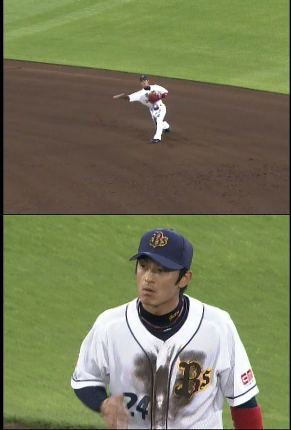 1塁への牽制球が1塁ランナー後藤の肩に当たった!ボールが転々としている間にランナーがそれぞれ進塁! オ2-3巨 |