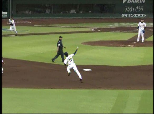 2番 木村拓 遊ゴ センター前へ抜けそうな当たりをショート大引がキャッチ!そのままの勢いで1回転し、1塁送球!ファンイプレー!! |