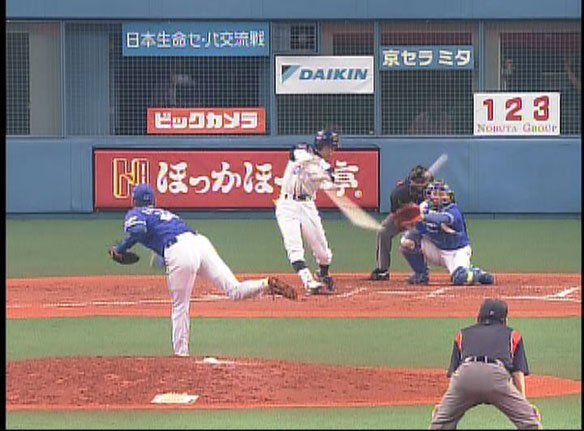 投手 山北 4番 ローズ 空三振 外角低めに逃げるような変化球にバットが届かず… |