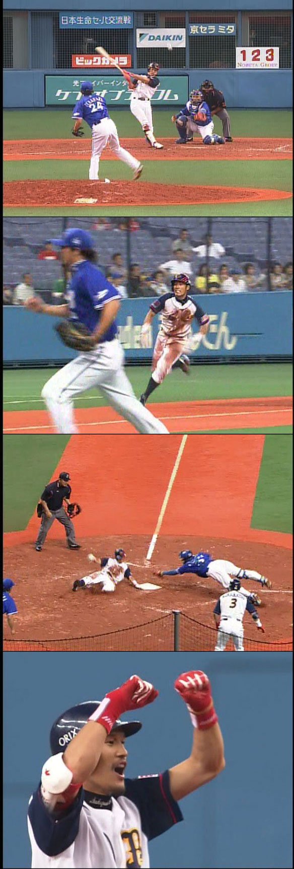 1番 坂口 中安 2-1からカットで粘り、高めの変化球をセンター返し!森山は2塁を蹴って本塁へ! センターからの送球が逸れ、逆転に成功!! 本塁送球間に、バッターランナー坂口は2塁へ! オ6-5横 ![]() 5