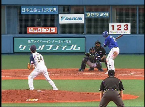 投手 オルティズ 1番 金城 見三振 フルカウントから外角いっぱいに133km/hの変化球が決まった! |