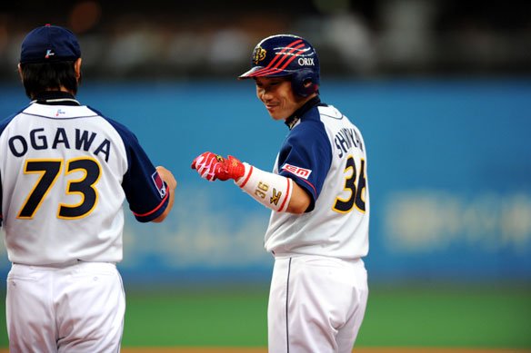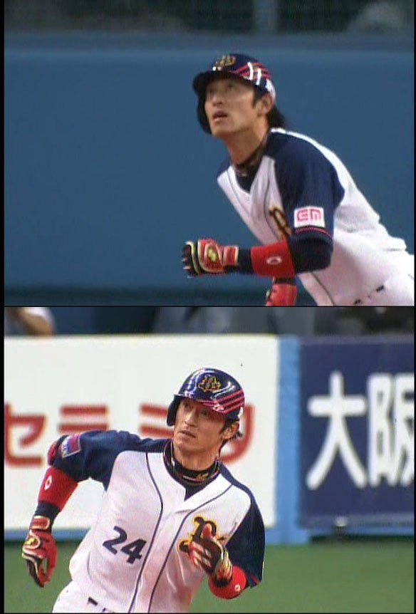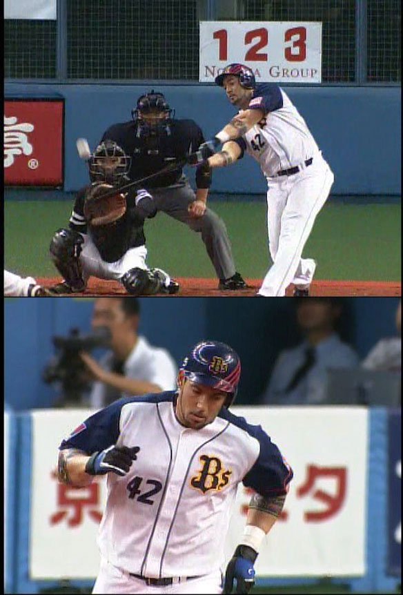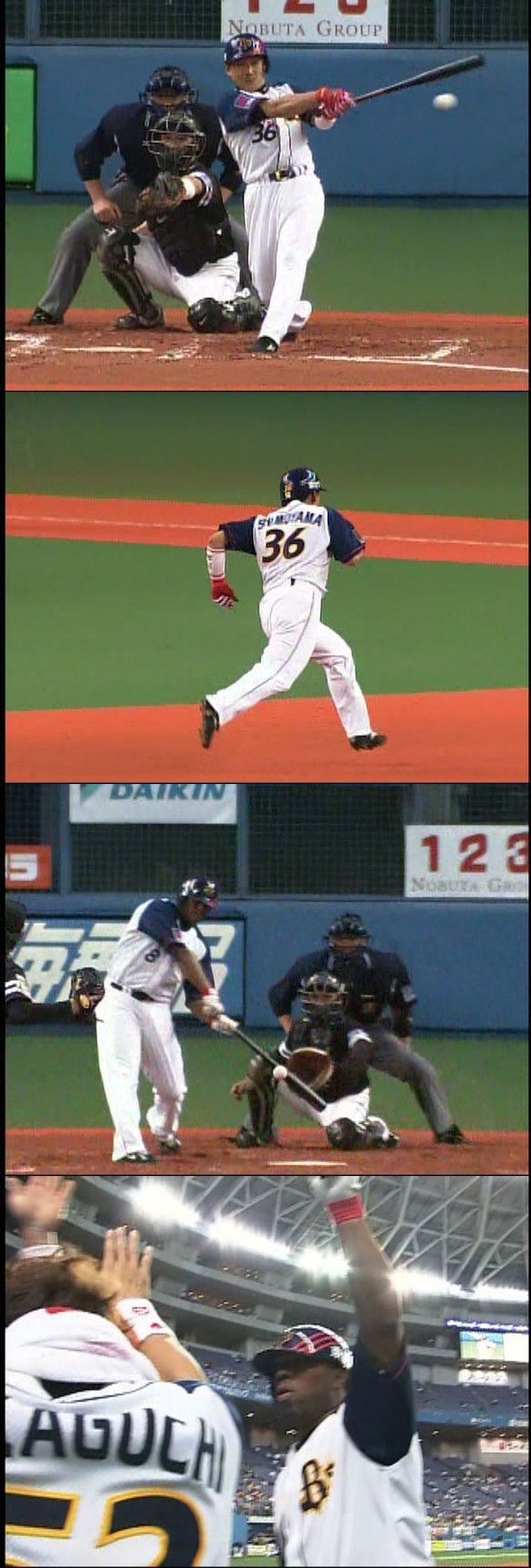3番 松中 左安 フルカウントから真ん中高めのストレートをレフト前に打ち返される |