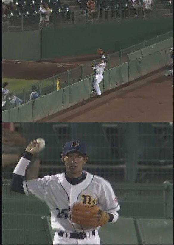 投手 加藤大 8番 石井 中本 高めのストレートを振りぬかれると、センター坂口がフェンス際まで下がってジャンプするが… オ2-3西 ![]() 2