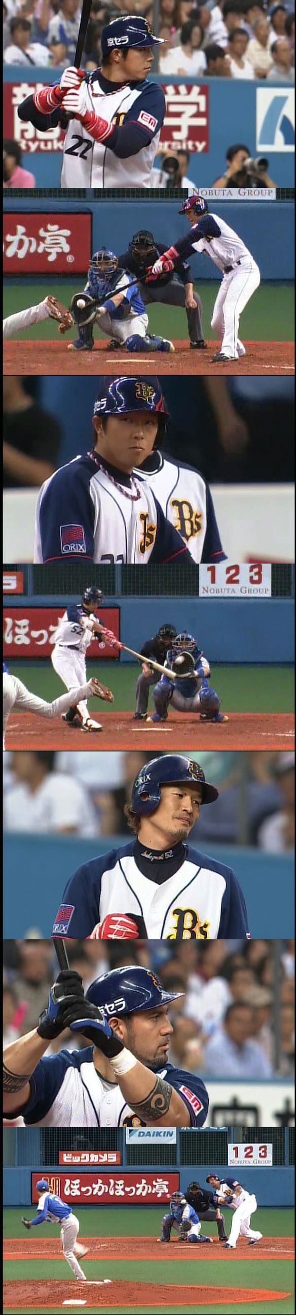 投手 西口 4番 ローズ 空三振 フルカウントからど真ん中への131km/hの変化球にタイミングが合わず |