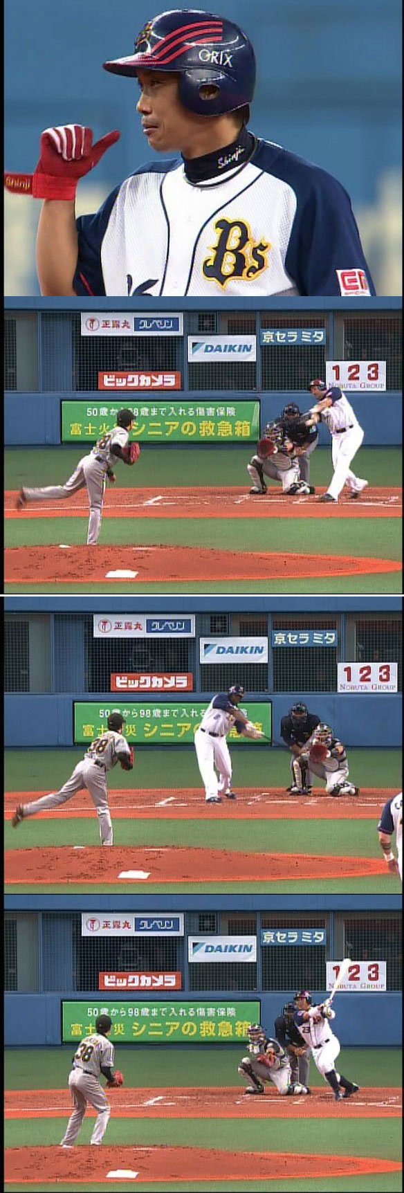 投手 武田勝 5番 北川 中安 バットを折られながらも打球は左中間にポトリ♪ |