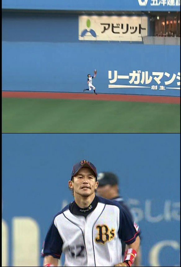 8番 金子誠 左飛 2-2からファウルで粘られるが、高めの121km/hの変化球を打たせ、相川が少し下がったところでキャッチ! |