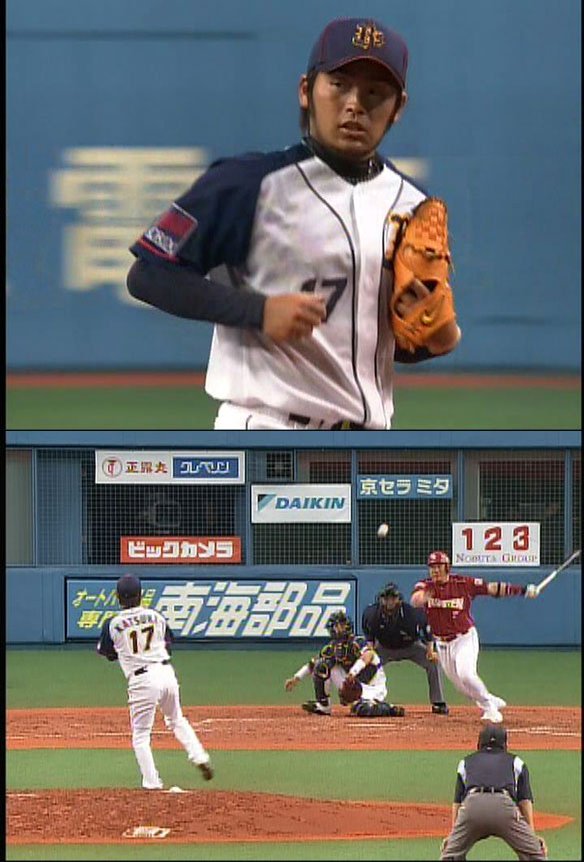 投手 香月 1番 鉄平 二ゴ 130km/hの変化球を引っ掛けさせ、先頭打者をキッチリと打ち取った! |