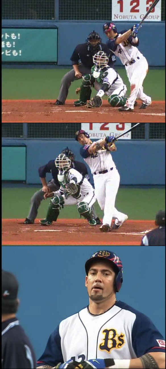 3番 カブレラ 左翼二 フルカウントから1球カットし、真ん中外よりの直球をフルスウィング!強烈な打球がサードの上空を越えて行ったぁ!! バファローズ勝越し!! オ2-1ソ ![]() 2