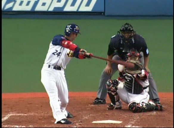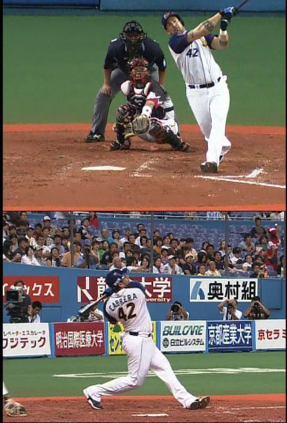 投手 大嶺 4番 ローズ 中越二 右中間へ上がった打球はあと少しでスタンドインと言うフェンスダイレクトのツーベースヒット! |