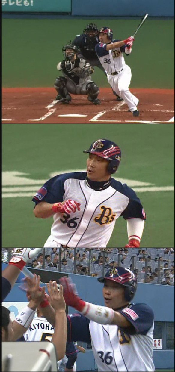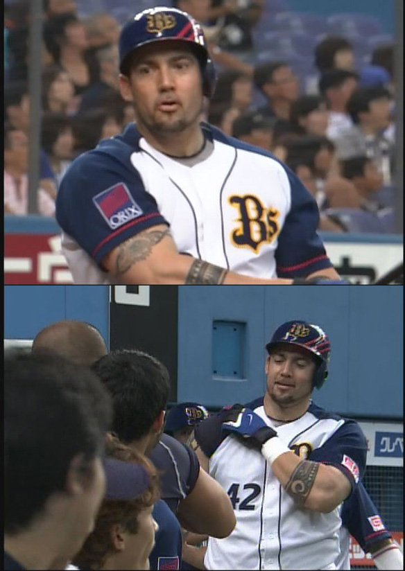 3番 カブレラ 右安 2-2からファウルで粘り、10球目の外角低めの明らかなボール球を打ちに行くと、打球は一二塁間を抜けた! 2塁ランナー坂口は3塁を蹴って本塁突入!ライトからホームへ良い送球が来るも、クロスプレーの判定はセーフ! さらにこの間にバッターランナーカブレラは2塁を奪った! オ3-0日 ![]() 3