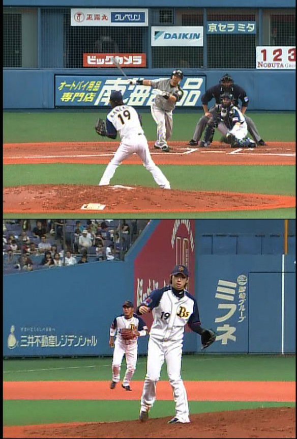 投手 多田野 5番 北川 遊ゴ 128km/hの変化球を捉えきれず、ショート右側へのゴロ |