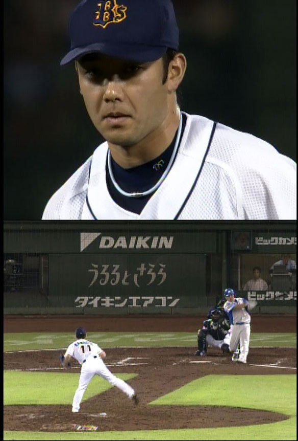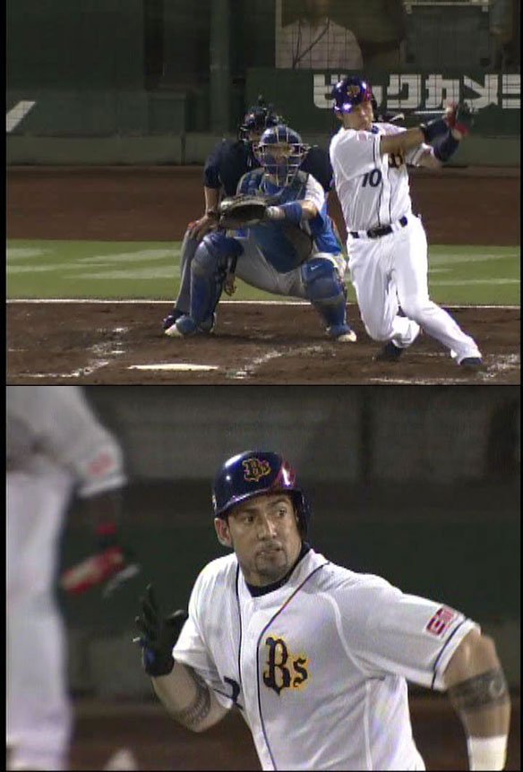 1番 下山 一ゴ失 アウトコースへの変化球を打ち損じるが、ファーストがこの当たりを弾いた!セカンドがバックアップして本塁へ投げるが、2塁ランナー大引が生還! 相手のミスに乗じて勝越しに成功!! オ2-1西 |