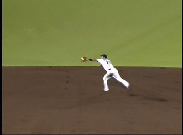 投手 岸田 4番 中島 三ゴ 三遊間への当たりは北川が捌いて1塁へ送り、ワンバウンドした送球をカブレラが華麗にすくい上げた! |