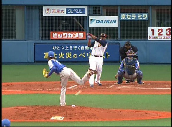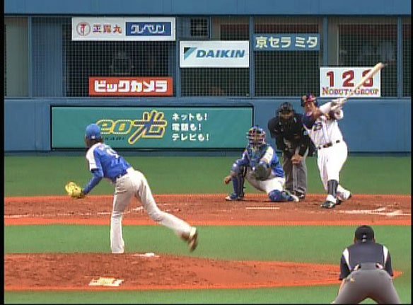 投手 山本 4番 江藤 右飛 フルカウントからアウトコースへの134km/hのストレートを打ち損じた! |