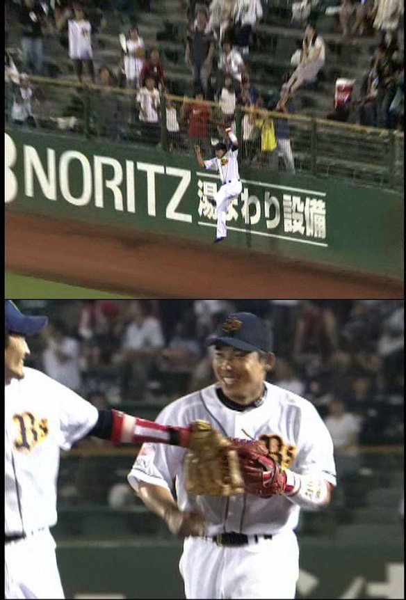 4番 松中 右飛 ライトスタンドへ入ったと思われた打球は下山がフェンスいっぱいのところで見事にジャンピングキャッチ! ファインプレー!! |