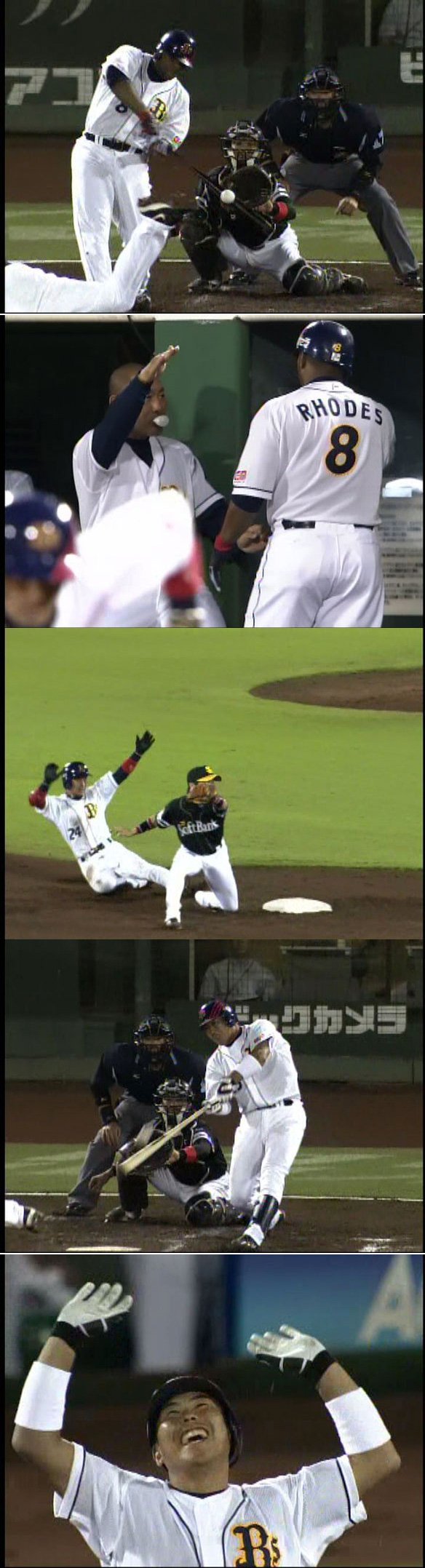 9番 小瀬 三犠失 初球、3塁方向へ強めのセーフティバントを仕掛けると、サードが1塁へ悪送球! 3塁を蹴った大引は悠々生還!! オ5-1ソ |