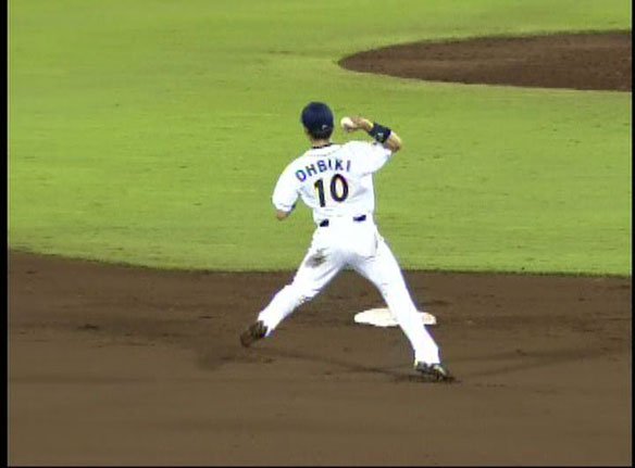 6番 大村 遊ゴ 三遊間へ流されたゴロを大引が素早く捌き、1塁へワンバウンドした難しい送球をカブレラが見事にすくい上げた! |