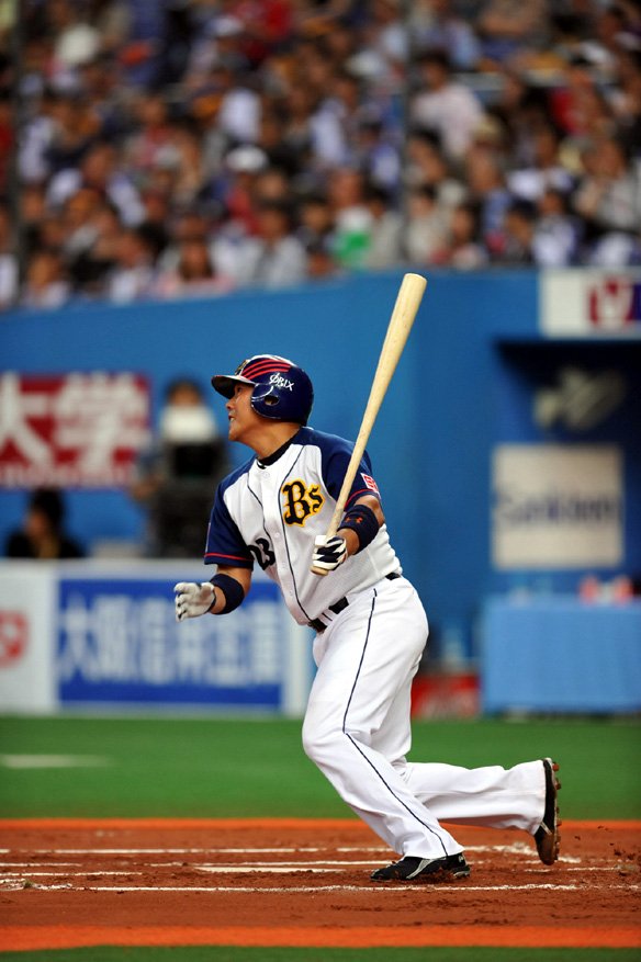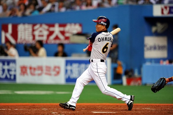 投手 平野佳 7番 中村紀 空三振 2-2からインコース高めに浮いた133km/hの変化球にバットが空を切った! |