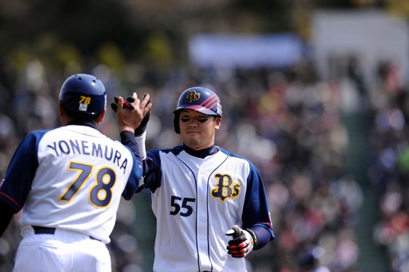 6番 T-岡田 左安 インハイへ続けてきたストレートを打ち返した当たりは、ショートの上空を越えるレフトへのタイムリーヒット! バファローズ、同点に追いつきなおもチャンス!! オ2-2楽 ![]() 2