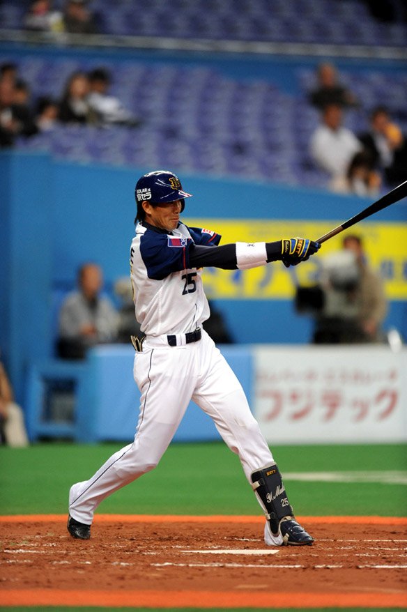 投手 平野佳 5番 二岡 空三振 外角低めへボールになる変化球にバットが空を切る! |